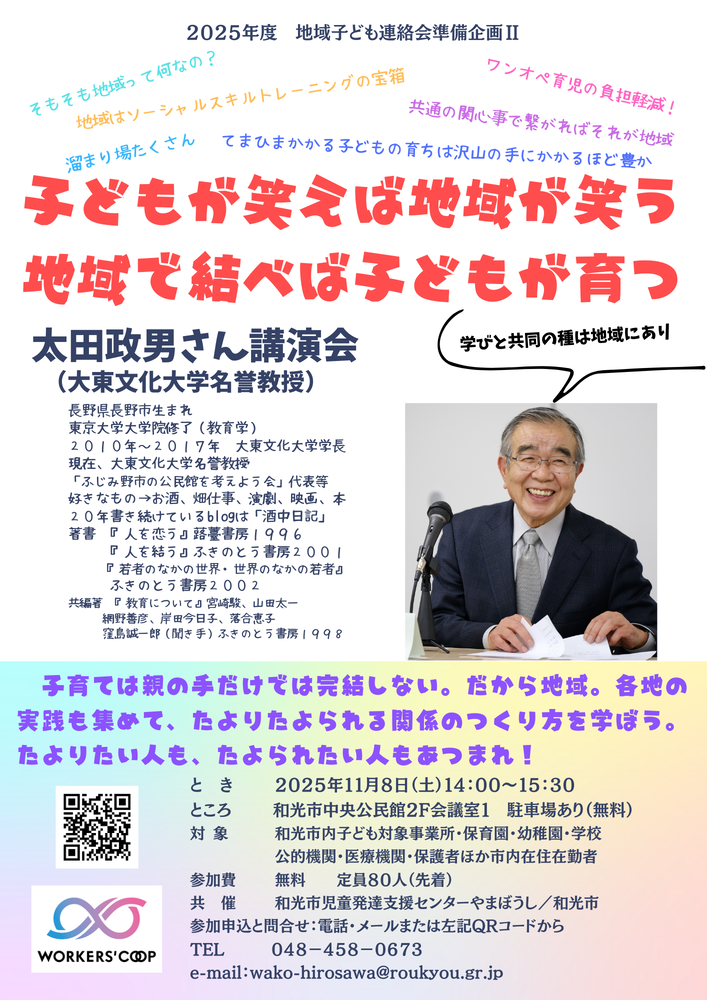 教育学者の太田政男さんを導き手に各地の実践にも学びつつ、保護者、支援者、市民など、それぞれの立場で、古くて新しい“地域ぐるみの子育て”を考える機会にしたいと思います。ぜひご参加ください。