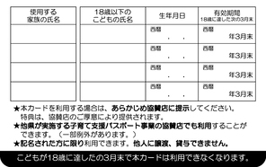 この事業はパパ・ママ応援ショップ協賛店に「優待カード」を提示することで、割引等の優待を受けられるものです。