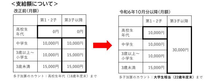 10月分(12月支給分)以降は、制度改正後の金額で支給します。 - 現在、3人以上(22歳到達後の最初の3月31日を迎えるまでの年齢に限る)のお子様を養育しており、かつ、大学生相当のお子様を養育している場合