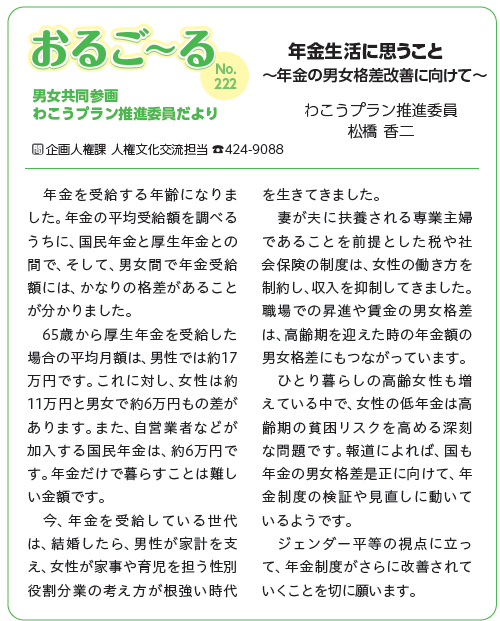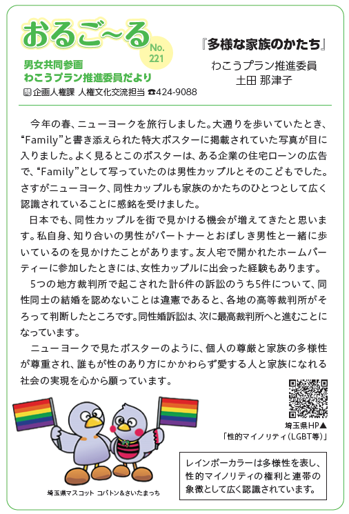 わこうプラン推進委員だよりは、男女共同参画わこうプラン推進委員が執筆している男女共同参画コラムで、広報わこうに掲載されています。